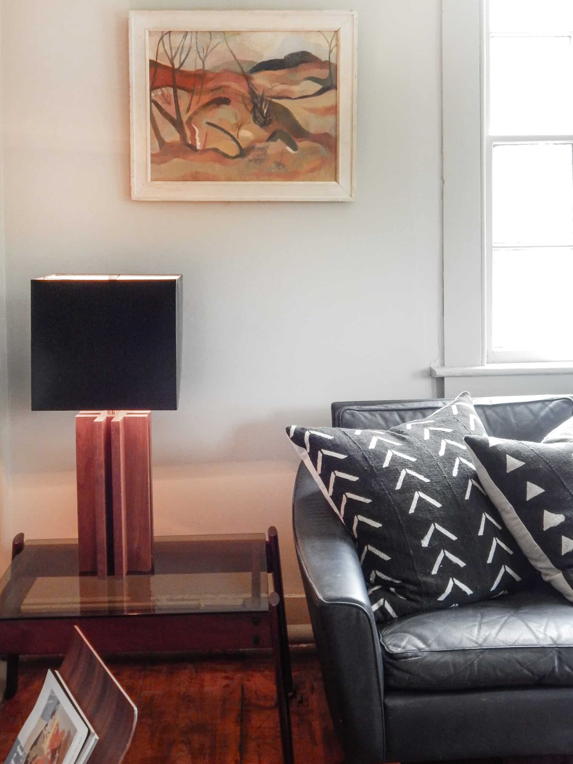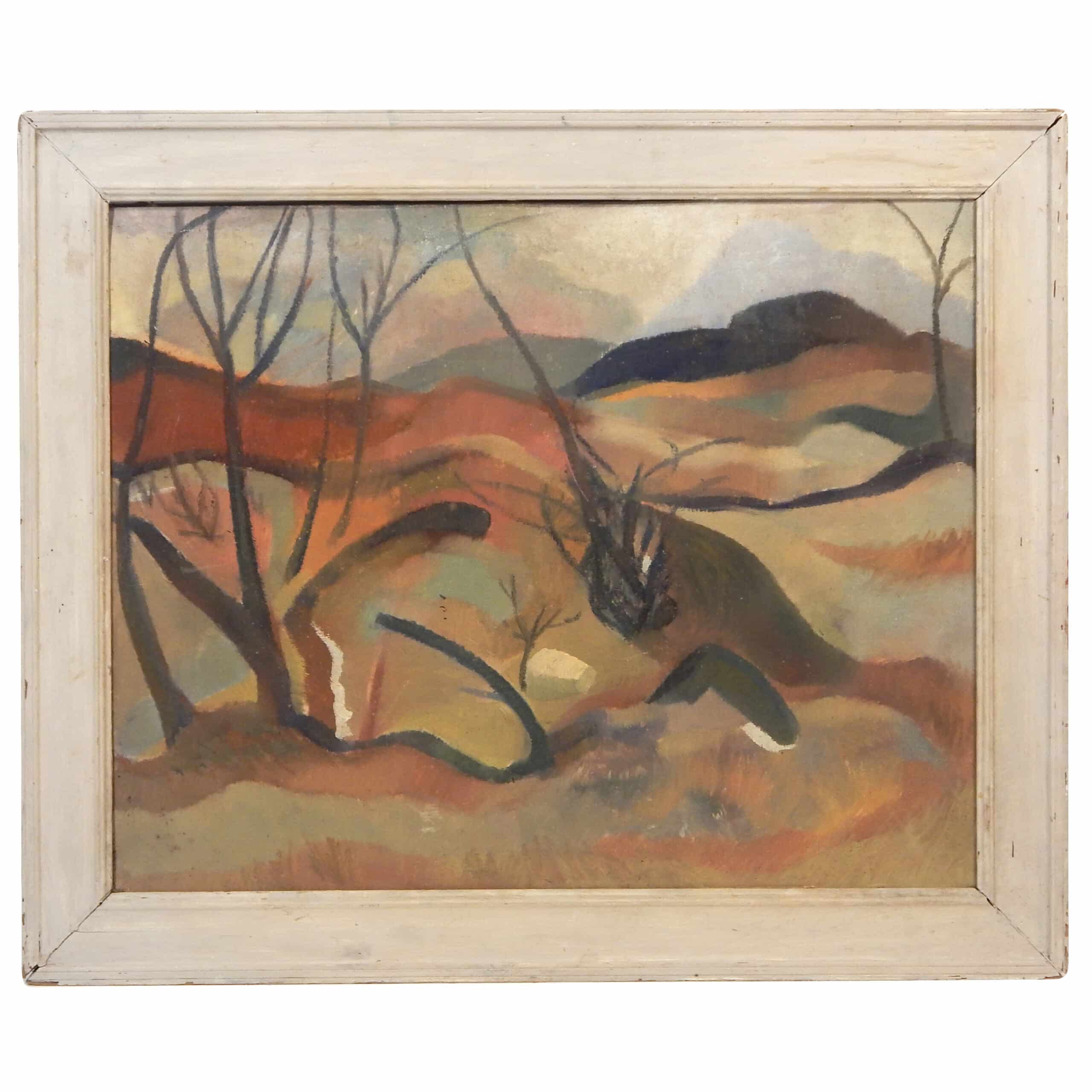 Modernist, Dreamlike Landscape of Mountains Beyond Trees in a Painted Wood Frame