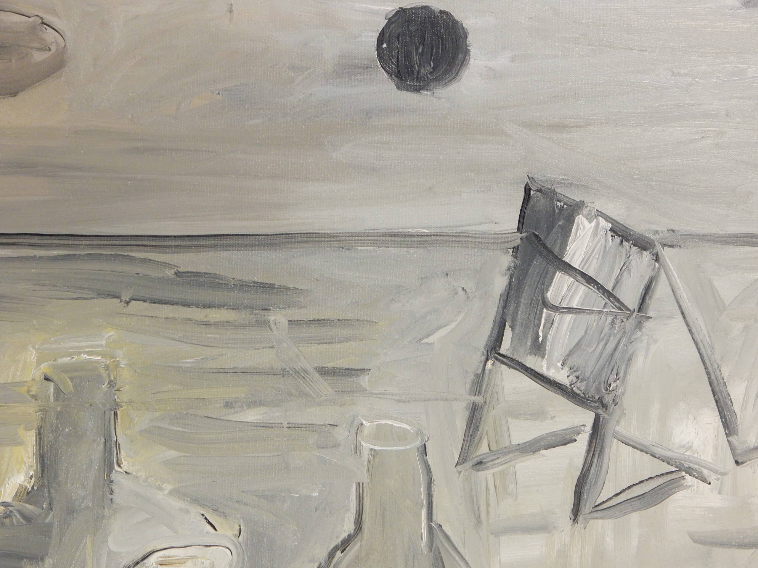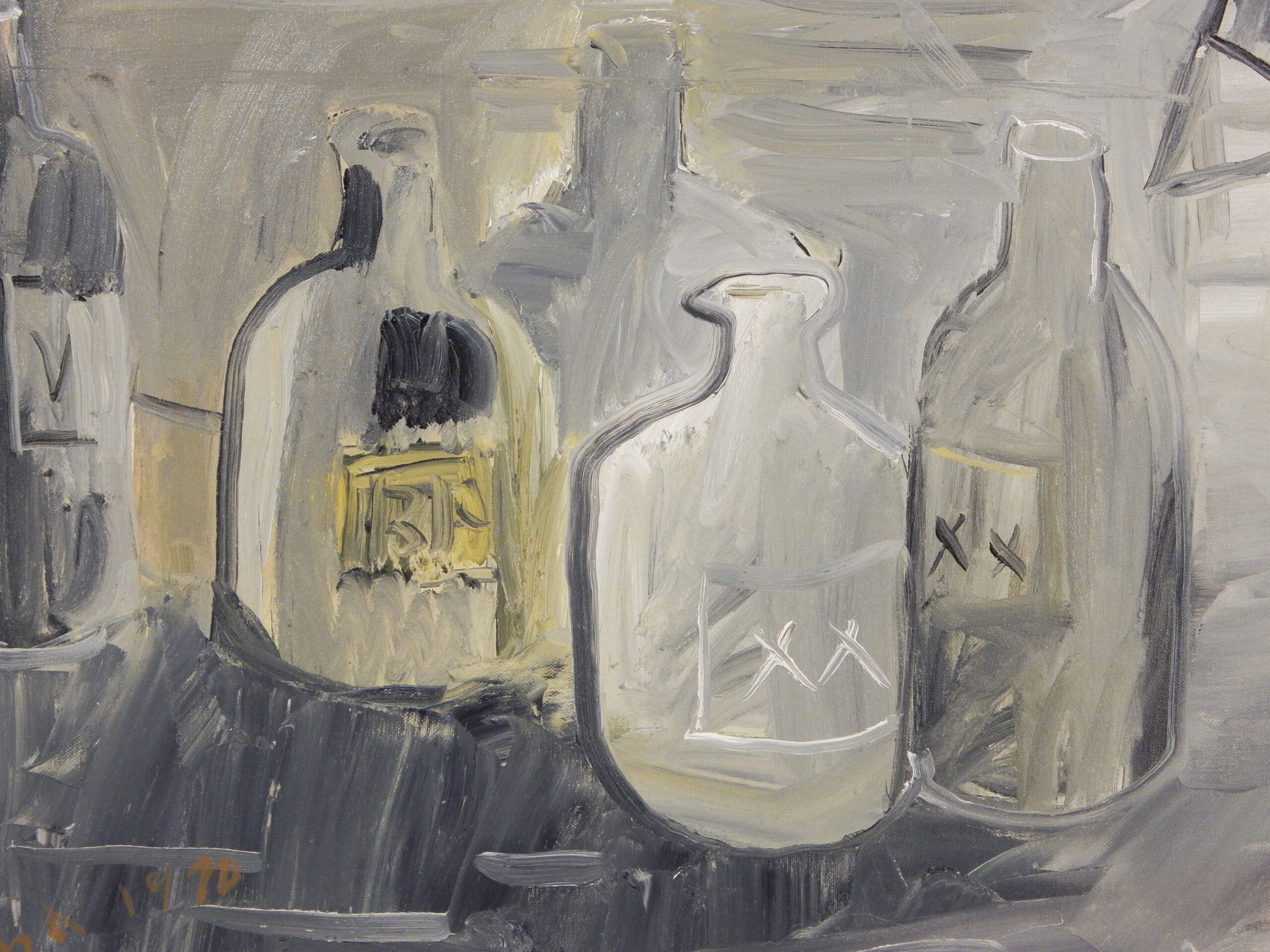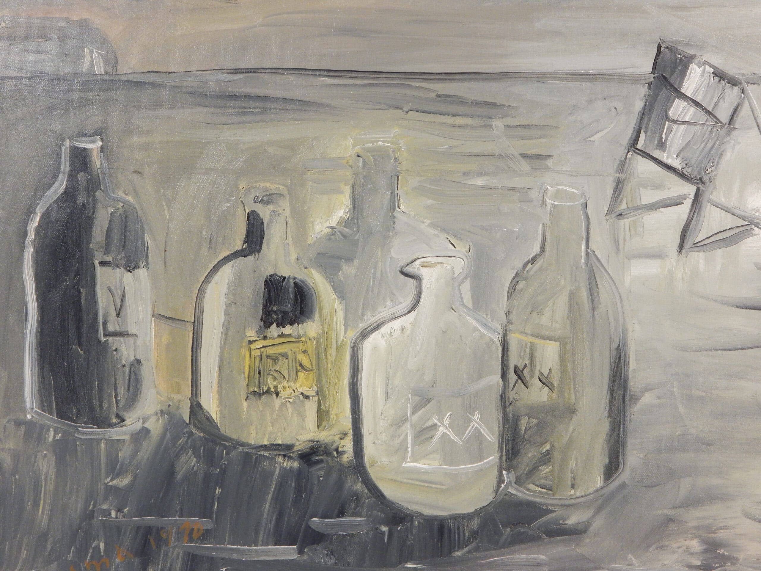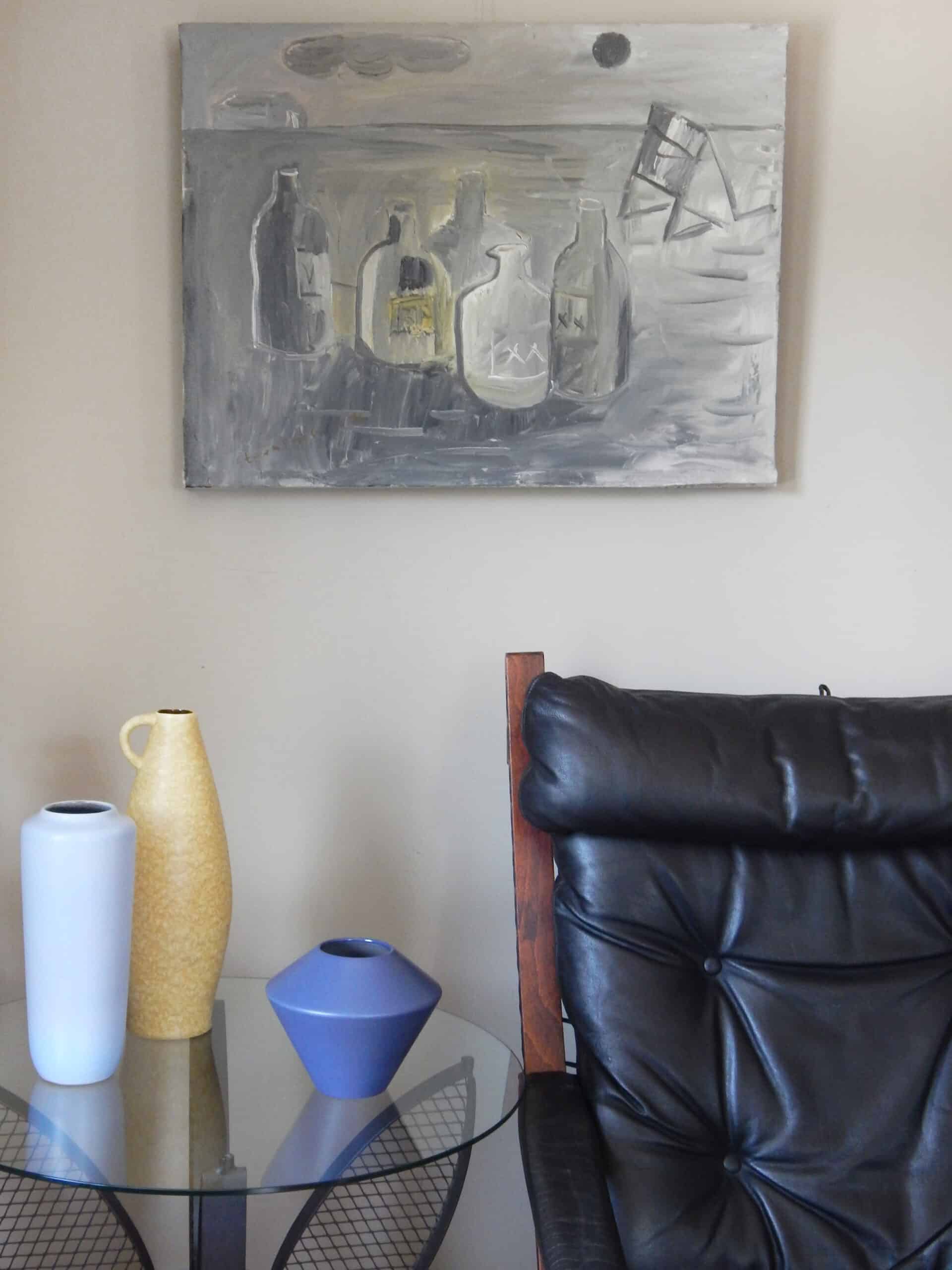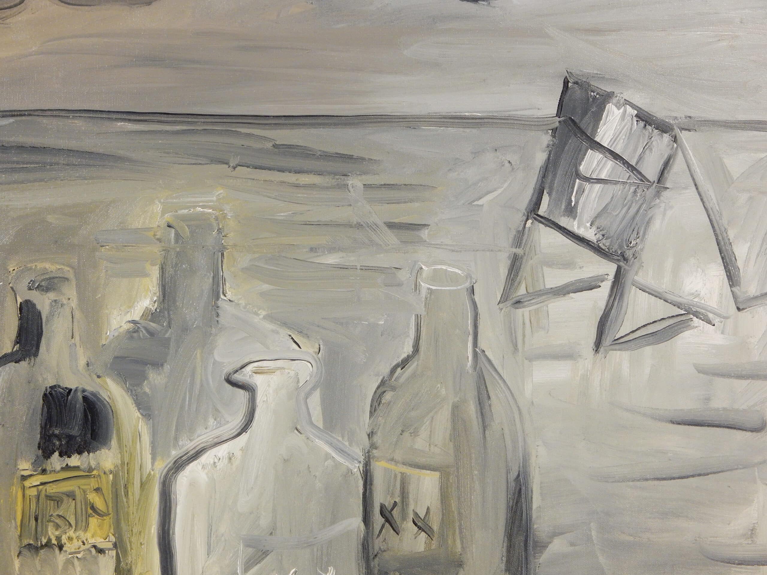 Unusual Gray Toned Landscape Painting with Bottles By Jay Steensma