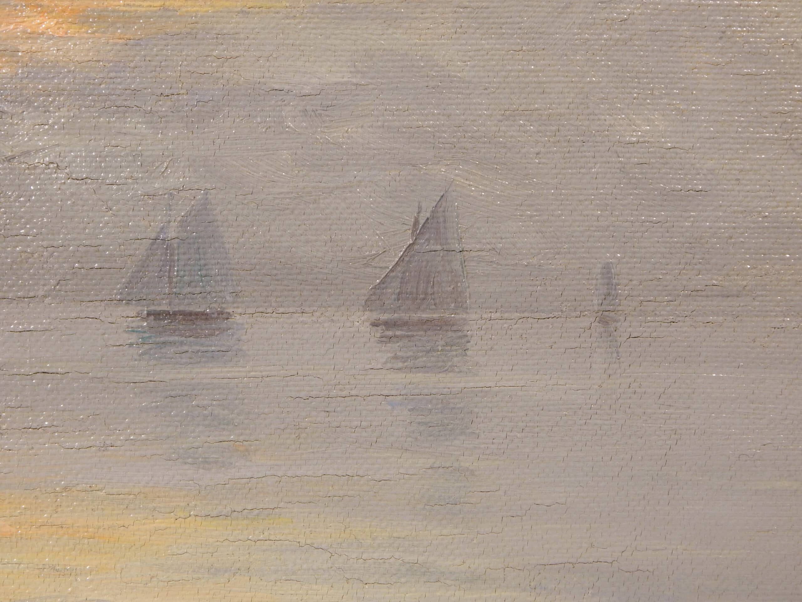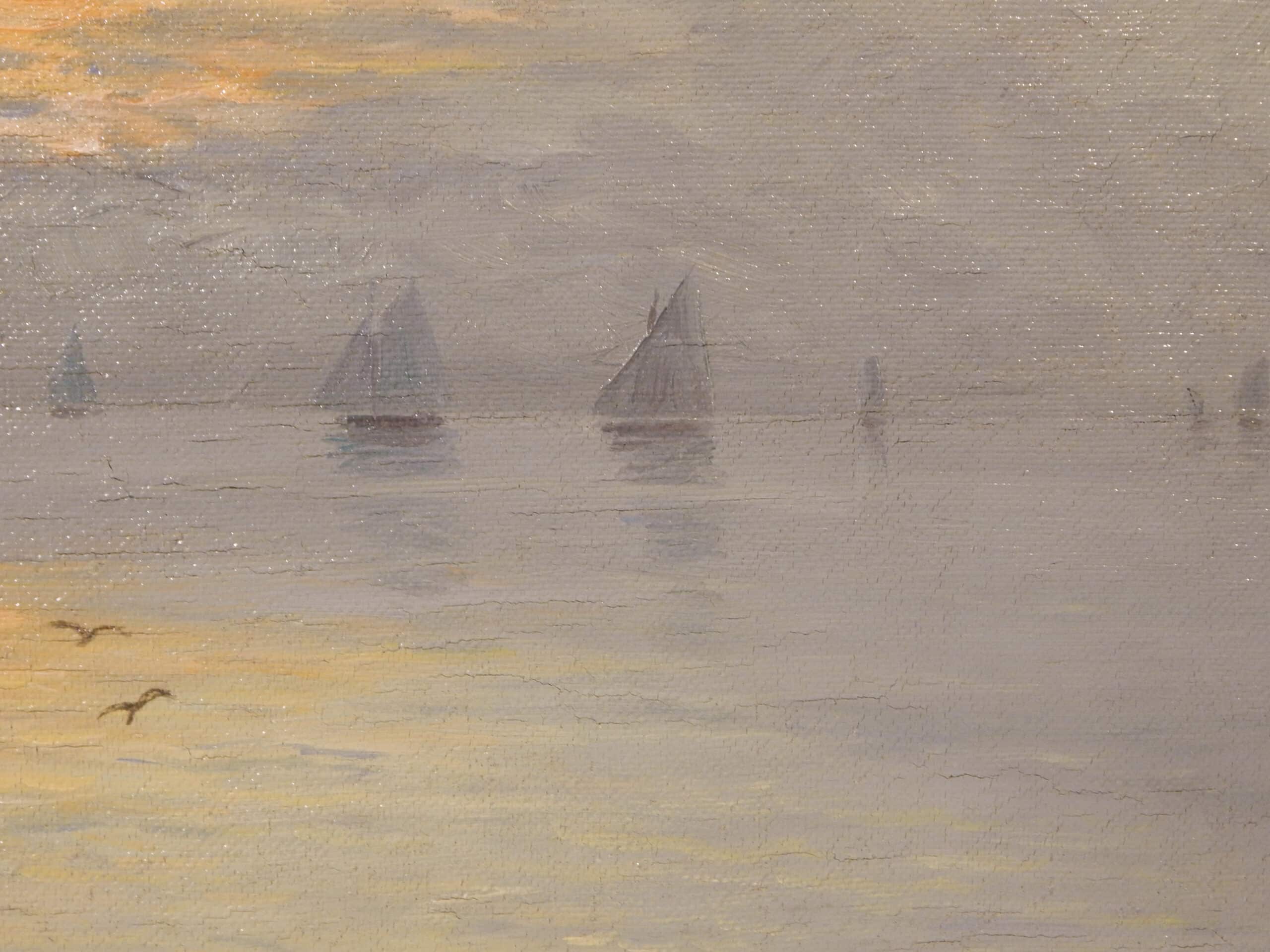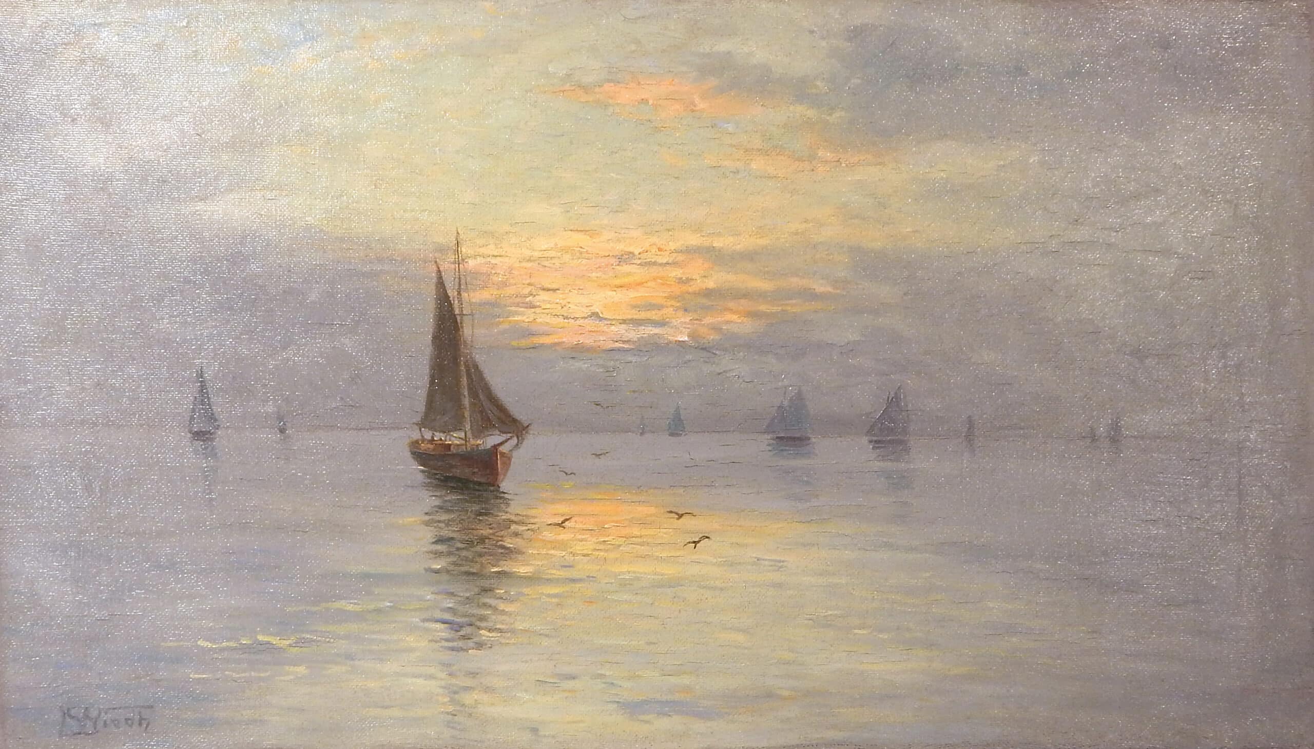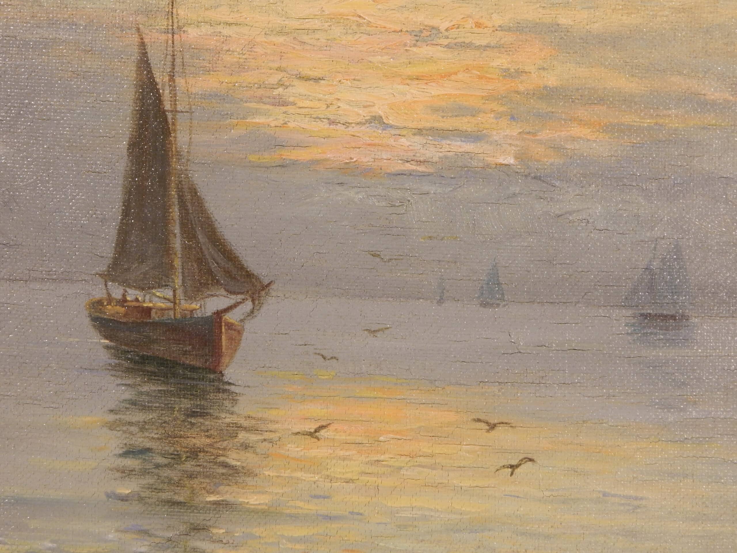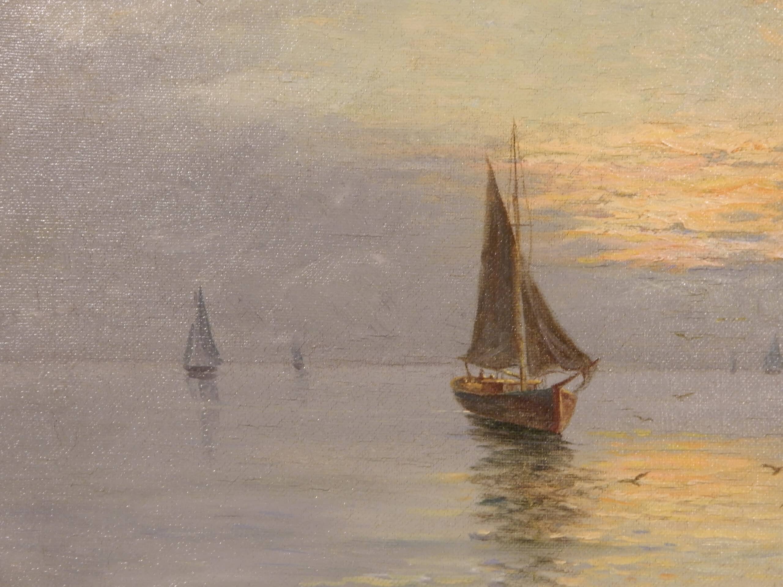 Early 20th Century Seascape of Sailboats at Sunset, Titled ‘Sailors Delight’ by L. Wiedh