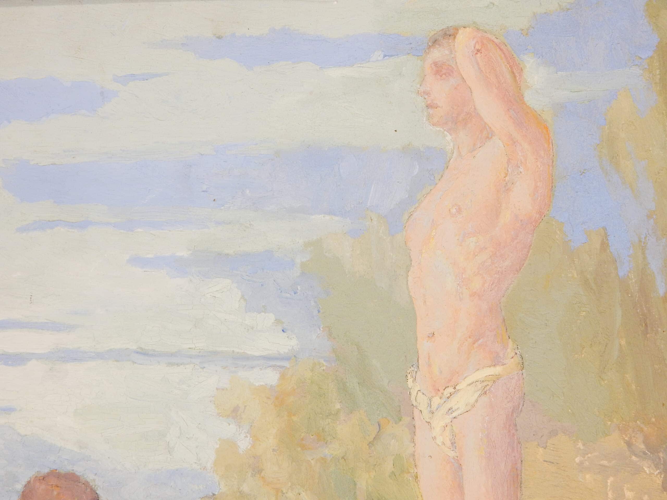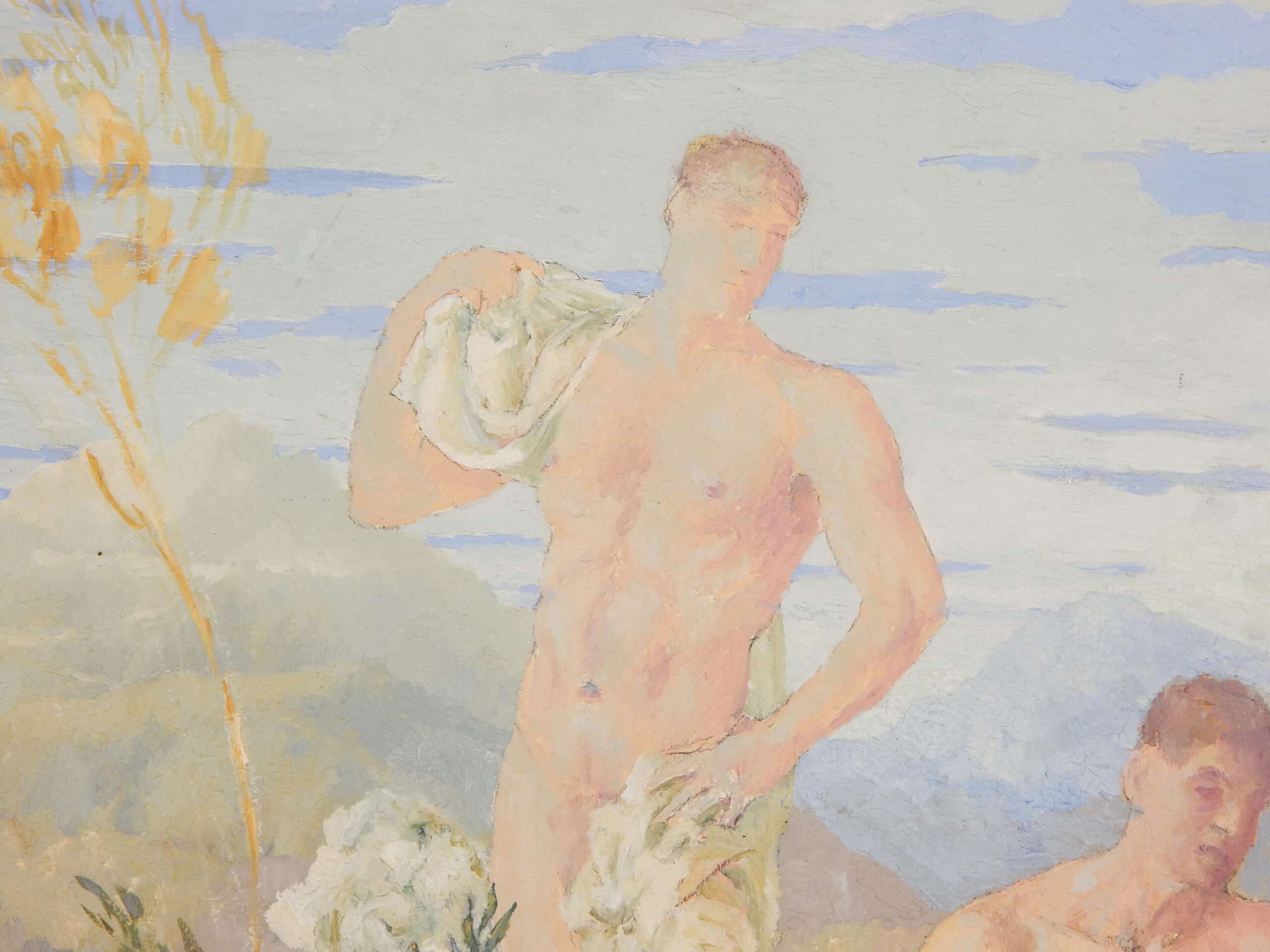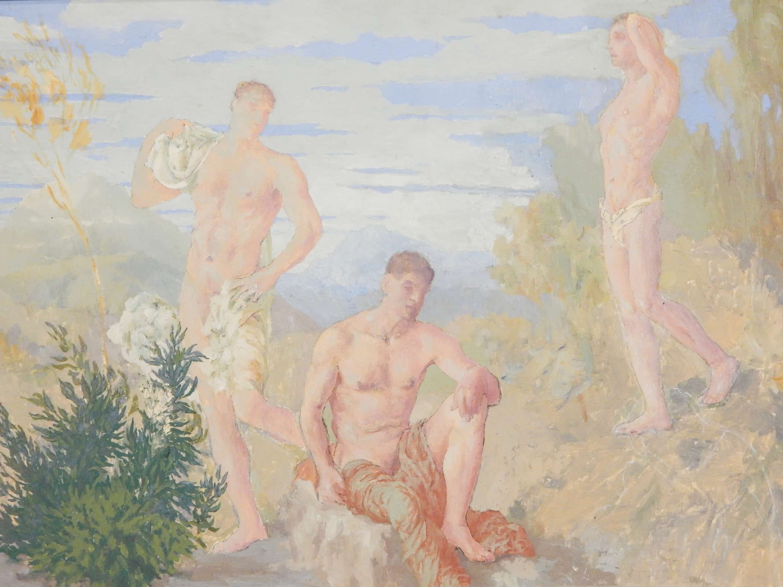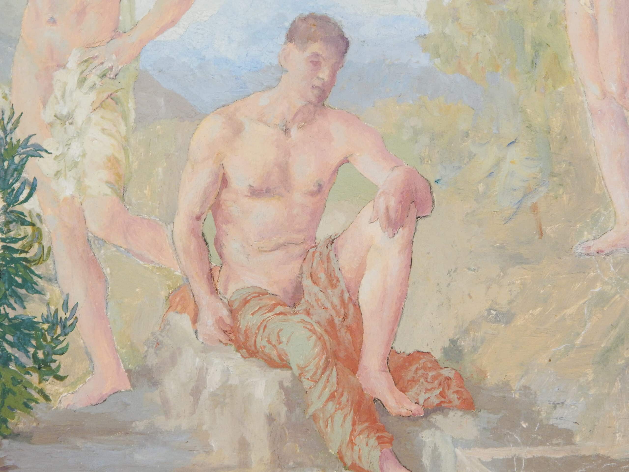 Unusually Painted Scene of Three Men Bathing In Nature
